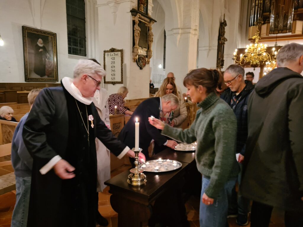 Borgerne i Helsingør trodsede novembermørket og kom til klimagudstjeneste i domkirken. Mange lokalpolitikere, herunder både borgmester og viceborgmester, sad da også på kirkebænkene og var med til at tænde lys i mørket. Temaet var håbshandlinger – noget vi konkret kan gøre hver især, når nu de store beslutninger på COP30 virker så langt udenfor vores rækkevidde. Sarah Ziethen, præst i Folkekirkens Nødhjælp, fortalte om klimaforandringernes hærgen i bl.a. Kenya, hvor især tørke er et af de store problemer. Alligevel vælger mennesker konkrete håbshandlinger – nemlig at plante træer. Sofie Larsen Kure, Grøn Kirke, fortalte om lokale håbshandlinger her i Danmark, som fx kan ses på kirkegården, der kan fungere som en lille biodiversitetsplet i lokalområdet.